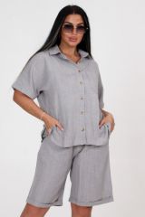 Костюм летний женский из льна представляет собой комплект - шорты и рубашка с коротким рукавом, который станет отличным дополнением Вашего гардероба. Данная модель выполнена из смесового льна. Благодаря добавке полиэстера, льняные ткани меньше мнутся ,быстро сохнут и не деформируются при стирке. Лавсан отличается одной очень примечательной особенностью – придаёт ткани повышенную износостойкость ,что позволит сохранить первоначальный вид изделия не на один сезон. Приобретая данный летний женский костюм, вы получаете не только полноценный образ, но и два отдельных элемента одежды. Рубашка отлично подойдет как к льняным или хлопковым брюкам и любым джинсам ,а шорты замечательно гармонируют с легкими блузами, спортивными и классическими топами ,всеми моделями и видами футболок.