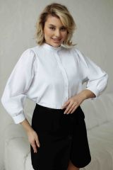 Женственная блузка с пышными свободными рукавами, нежной стойка и укороченным плечом. Сорочечная ткань, состав: 55% хлопка, 45%