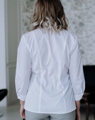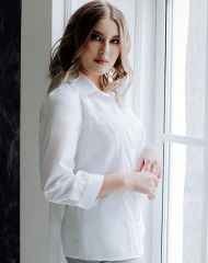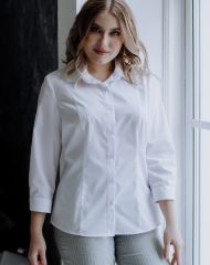 Эту блузку можно назвать моделью вне времени: скромная и в то же время элегантная, она поистине незаменима в классическом женском гардеробе. Блузка отличается простым, слегка приталенным кроем, рукавом 3/4 на манжетах, классическим воротником. Сорочечная ткань : 55% хлопка и 45% ПЭ