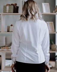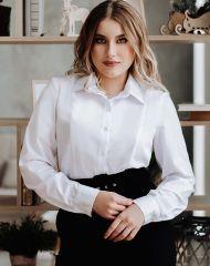 Классическая блузка полуприлегающего силуэта. Рукав длинный, воротник рубашечный. Данная блузка словно ждет дополнений- эффектная косынка, мужской галстук, яркие украшения помогут создать различные образы с этой универсальной и потому незаменимой блузкой. Сорочечная ткань: 55% хлопок, 45% ПЭ Цвет белый
