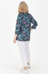 Женская футболка из набивного трикотажного полотна с фигурной планкой по горловине из однотонной ткани, дополненной декоративными пуговицами. Отделка карманов и манжеты рукавов выполнены из той же ткани, что и горловина. Футболка отлично садится на любую женскую фигуру благодаря свободному покрою и широкому размерному ряду.