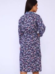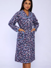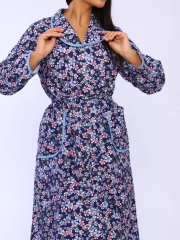 Халат женский, удлиненный, с бортовой застежкой на петли и пуговицы, на полочках нагрудная вышивка и накладные карманы округлой формы. Воротник отложной. Спинка цельная. Рукав длинный. Завязывающийся пояс. Край кармана, воротника, низ рукава окантованы отделочным цветом.