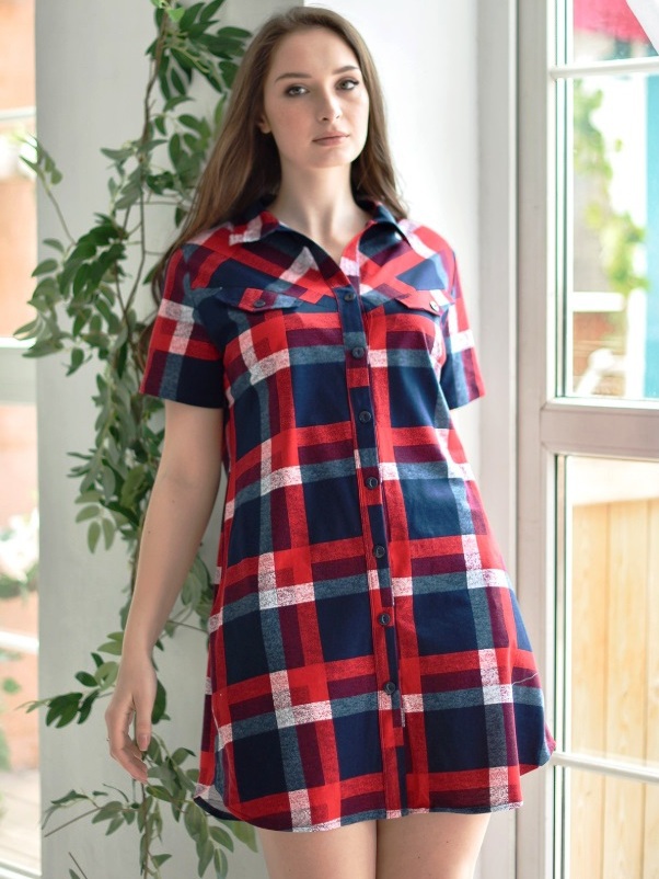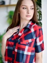Халат женский на планках и застежкой на пуговицы, с двумя боковыми карманами. Полочка с кокетками и клапанами на пуговицах. Воротник отложной. Рукав втачной, короткий. Низ изделия фигурный. Состав: Хлопок 100%