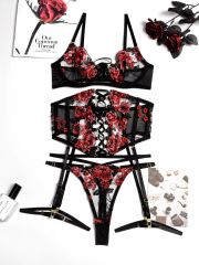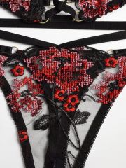 размер лифа: 80В Размер трусиков: L Трусики - стринги Корсет со стрипами Новинка, женское прозрачное кружевное Сетчатое нижнее белье, бюстгальтер, стринги, сексуальное, Сетчатое, с вышивкой сливы, эротическое белье, комплект из трех предметов, сексуальный комплект