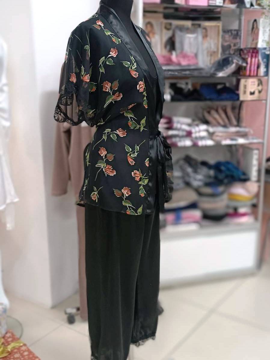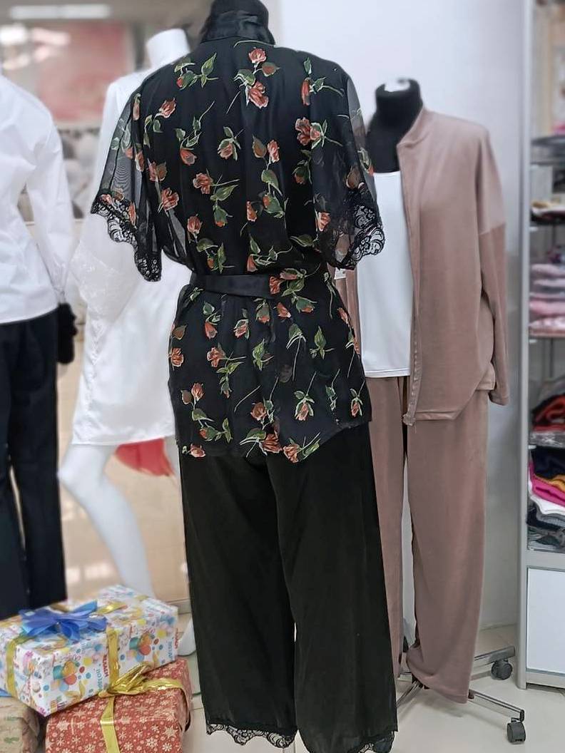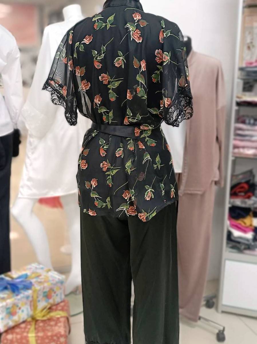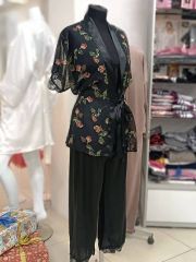 Комплект тройка Топ+бриджи+халат "Шелк Армани" мод 65-66 (черные-бутоны роз)