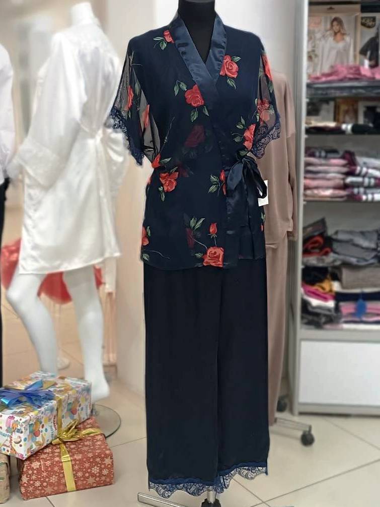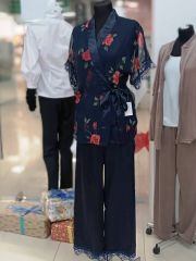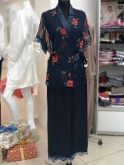 Комплект тройка Топ+бриджи+халат "Шелк Армани" мод 65-66 (синие-розы)