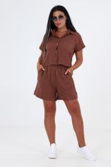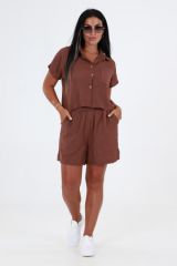Ткань: Лен Состав: 80% хб,15% п/э, 5% лавсан. Костюм летний женский из льна представляет собой комплект - шорты и рубашка с коротким рукавом, который станет отличным дополнением Вашего гардероба. Данная модель выполнена из смесового льна. Благодаря добавке полиэстера, льняные ткани меньше мнутся ,быстро сохнут и не деформируются при стирке. Лавсан отличается одной очень примечательной особенностью – придаёт ткани повышенную износостойкость ,что позволит сохранить первоначальный вид изделия не на один сезон. Приобретая данный летний женский костюм, вы получаете не только полноценный образ, но и два отдельных элемента одежды. Рубашка отлично подойдет как к льняным или хлопковым брюкам и любым джинсам ,а шорты замечательно гармонируют с легкими блузами, спортивными и классическими топами ,всеми моделями и видами футболок. Внимание: цвет на фото может не соответствовать точному цвету изделия и зависит от цветопередачи Вашего устройства! При уходе за костюмом ,пожалуйста ,следуйте инструкции на ярлычке. ЖЕЛАЕМ ВАМ КРАСИВЫХ, ПРАКТИЧНЫХ И НУЖНЫХ ПОКУПОК! Коллектив магазина ТВОЙ KAPRIZ.