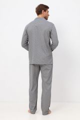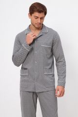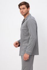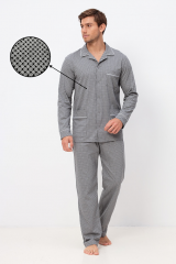 Мужская пижама из 100% хлопка, приятная к телу и не сковывает движений. В комплекте рубашка на пуговицах и с удобными карманами, так же прямые свободные брюки на поясной резинке. Рисунок на ткани в мелкую клетку. Отличный комплект, выполненный со вкусом, подойдёт каждому мужчине.