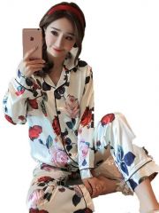 Классическая шелковистая пижама из атласной ткани, с брюками и рубашкой с длинным рукавом. Уютная и комфортная. Рубашка с отделкой контрастным кантом по борту, накладным карманом и костюмным воротником, застегивается на пуговицы. Брюки прямые, свободные на высокой посадке. Яркий принт всегда поднимет настроение!