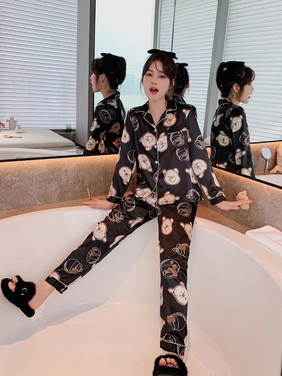 Классическая шелковистая пижама из атласной ткани, с брюками и рубашкой с длинным рукавом. Уютная и комфортная. Рубашка с отделкой контрастным кантом по борту, накладным карманом и костюмным воротником, застегивается на пуговицы. Брюки прямые, свободные на высокой посадке. Яркий принт всегда поднимет настроение!