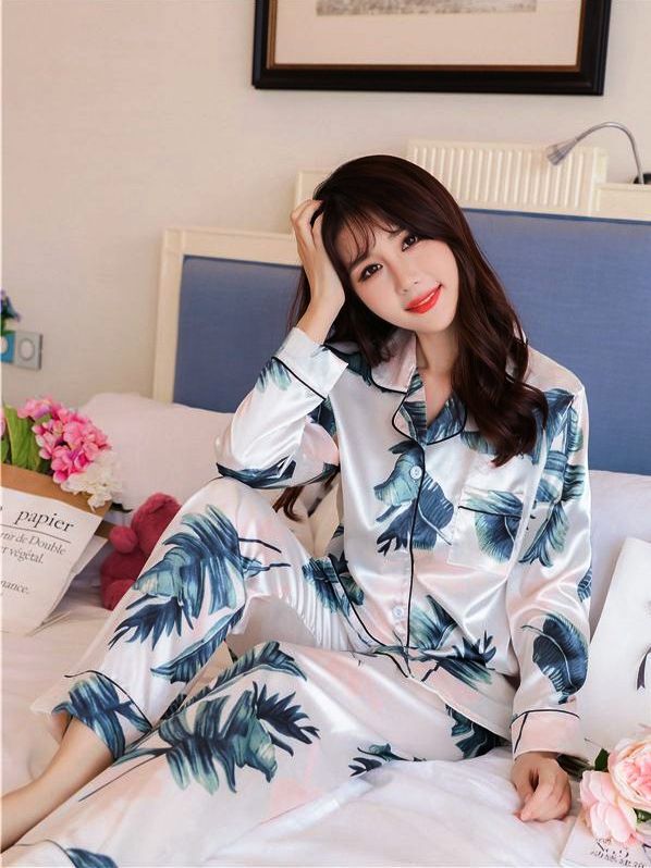 Классическая шелковистая пижама из атласной ткани, с брюками и рубашкой с длинным рукавом. Уютная и комфортная. Рубашка с отделкой контрастным кантом по борту, накладным карманом и костюмным воротником, застегивается на пуговицы. Брюки прямые, свободные на высокой посадке. Яркий принт всегда поднимет настроение!