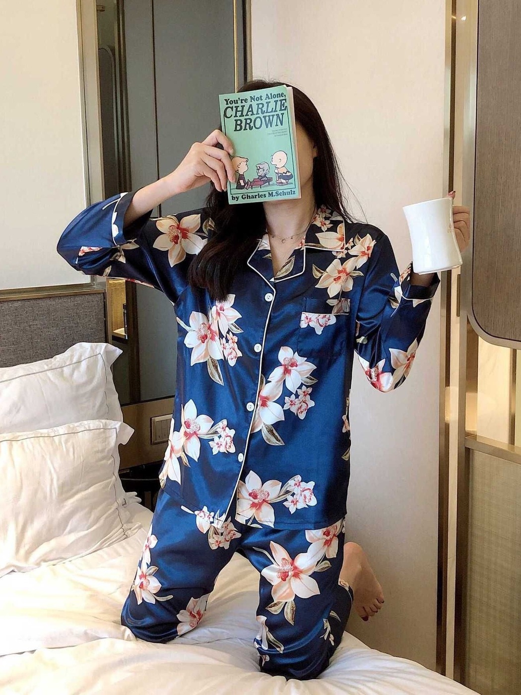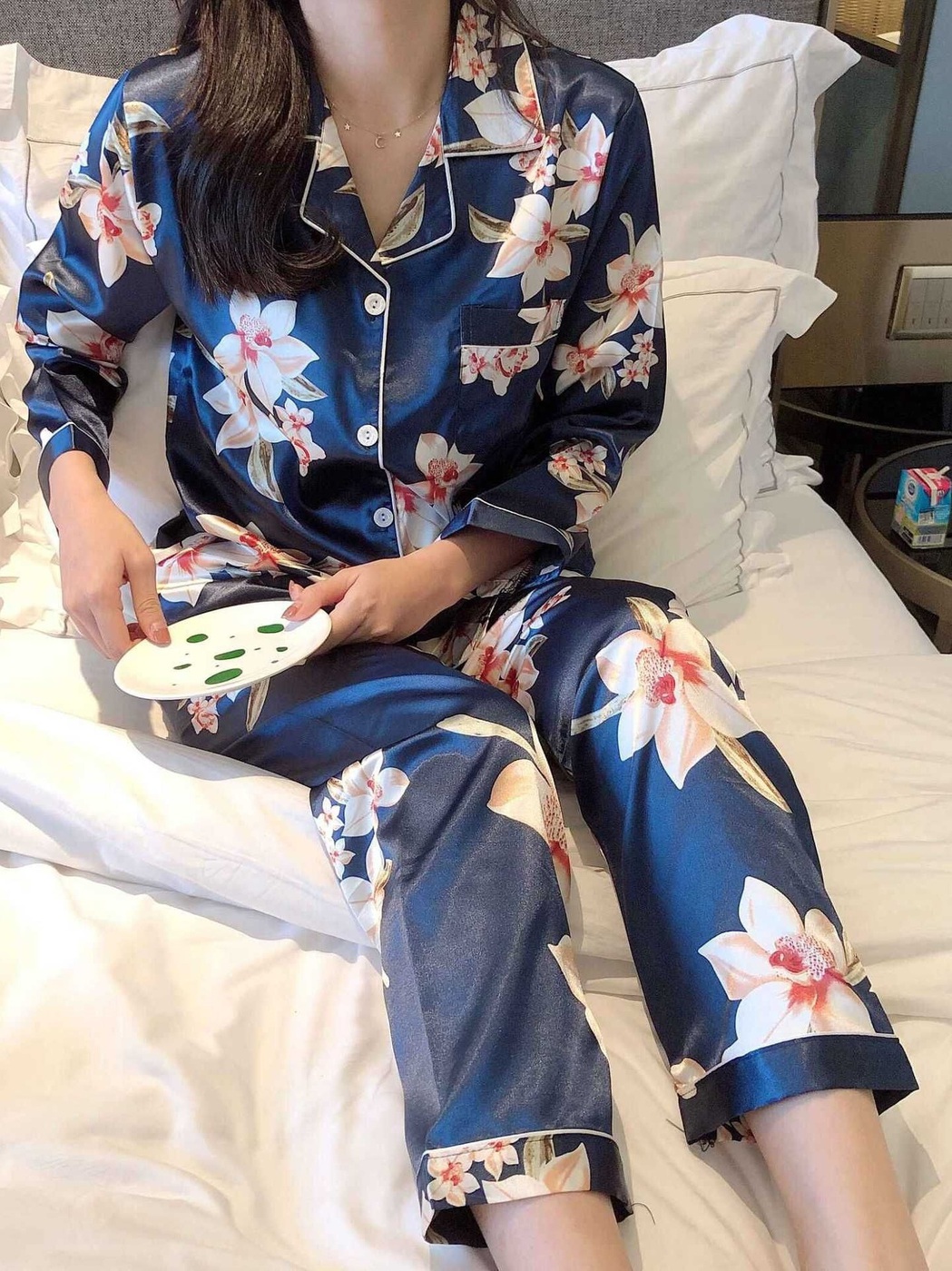 Классическая шелковистая пижама из атласной ткани, с брюками и рубашкой с длинным рукавом. Уютная и комфортная. Рубашка с отделкой контрастным кантом по борту, накладным карманом и костюмным воротником, застегивается на пуговицы. Брюки прямые, свободные на высокой посадке. Яркий принт всегда поднимет настроение!