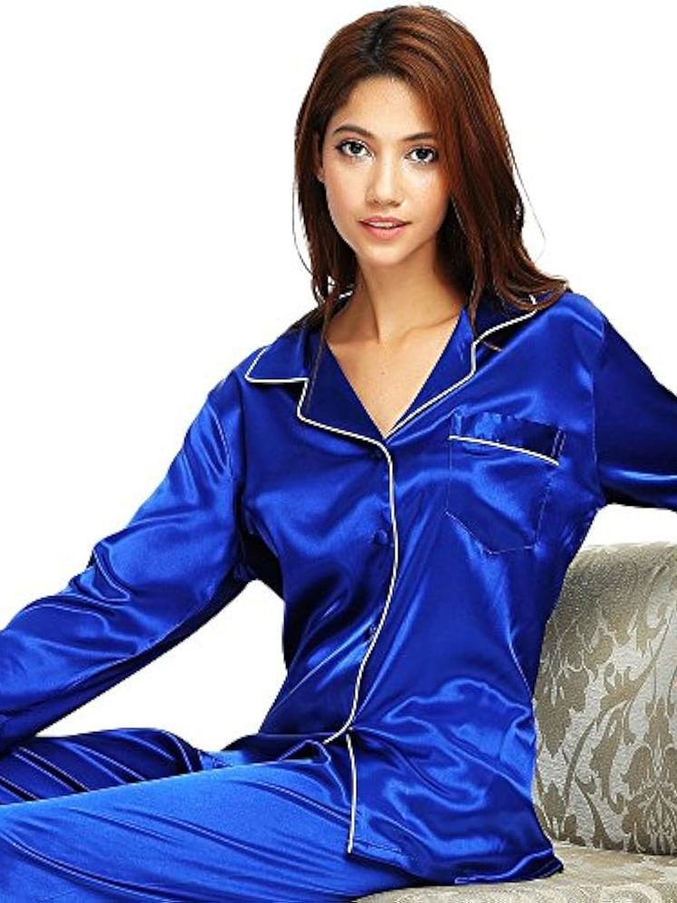 Классическая шелковистая пижама из атласной ткани, с брюками и рубашкой с длинным рукавом. Уютная и комфортная. Рубашка с отделкой контрастным кантом по борту, накладным карманом и костюмным воротником, застегивается на пуговицы. Брюки прямые, свободные на высокой посадке. Яркий принт всегда поднимет настроение!