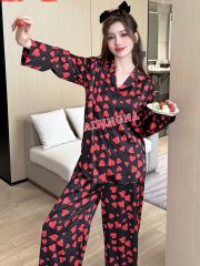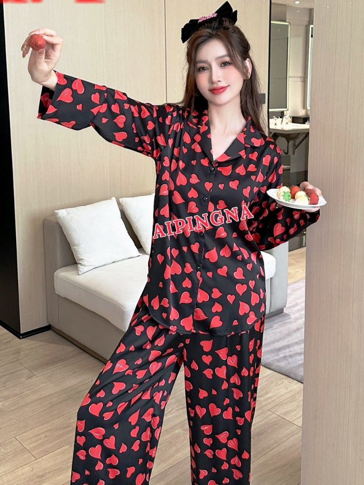 Пижама шелк с брюками AIPINGNA 5306 (черная с красными сердечками)