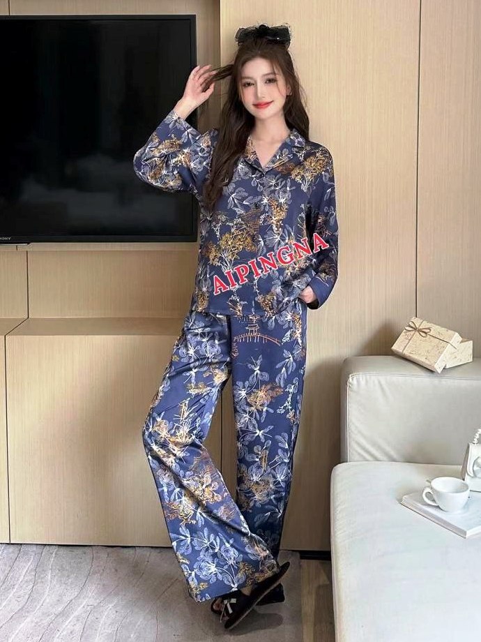 Пижама шелк с брюками AIPINGNA 6101 (синяя рисунок)