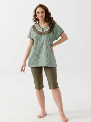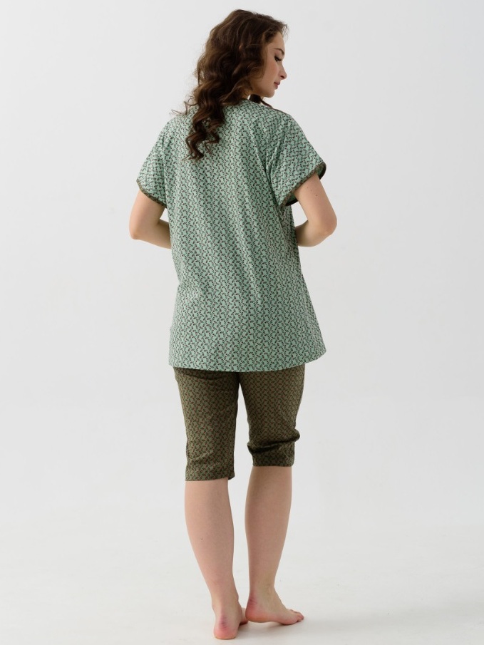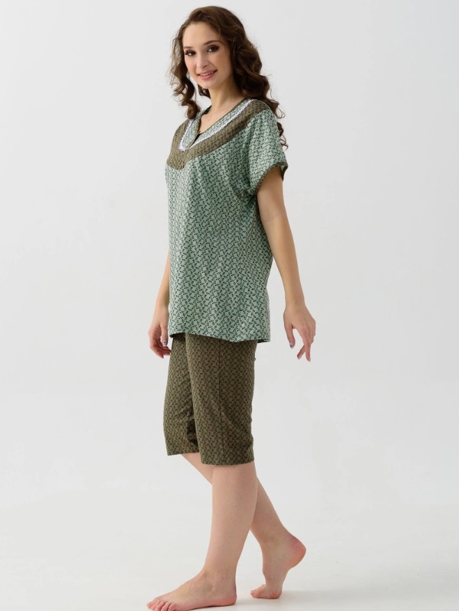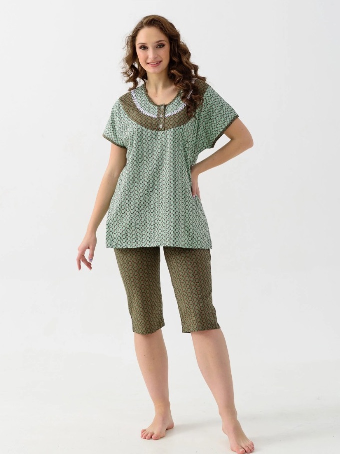 Пижама женская состоит из футболки и бридж. Футболка с круглым вырезом горловины и цельнокроеным рукавом. На полочке фигурная кокетка из отделочного материала отделанная кружевом, на планках с застежкой на кнопки. Горловина и низ рукавов окантованы отделочным материалом. Бриджи прямые из набивного полотна, верх на резинке, низ окантован отделочным материалом. Машинная стирка. Состав: 100% Хлопок