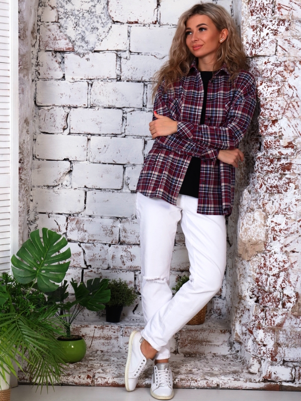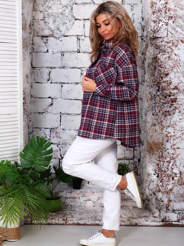 Описание: В клетку женская рубашка-оверсайз, силуэт прямой.  Цвет и рисунок: согласно фото Ткань: фуле, хлопок 100%