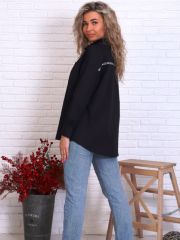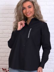Описание: Чёрная рубашка, умеренно выраженный оверсайз, длинный рукав с манжетом с 2 пуговицами, воротник на отрезной стойке, два нагрудных кармана. Декоративная репсовая лента с буквами (утюжить с изнанки). Универсальный выбор для работы и для отдыха. Цвет и рисунок: согласно фото Ткань: тиси хлопок 35% + п/э 65%