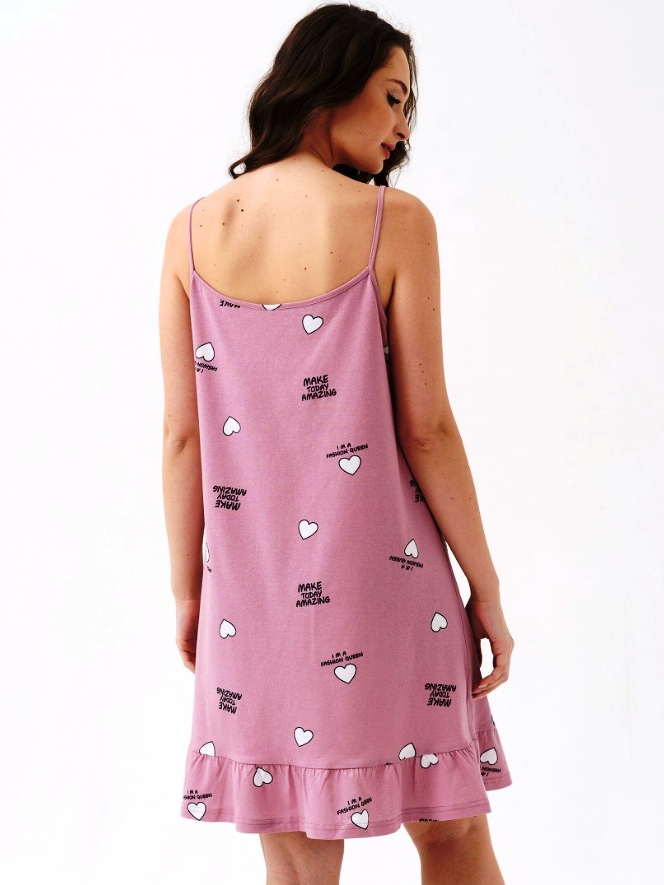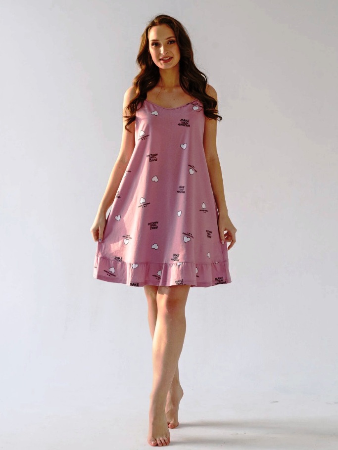 Сорочка женская хлопчатобумажного полотна. Изделие полуприлегающего А -силуэта, длиной немного выше линии колена. Тонкие бретели сорочки и притачной волан по низу изделия, создают волшебный лёгкий и романтичный образ. Состав: 100% Хлопок
