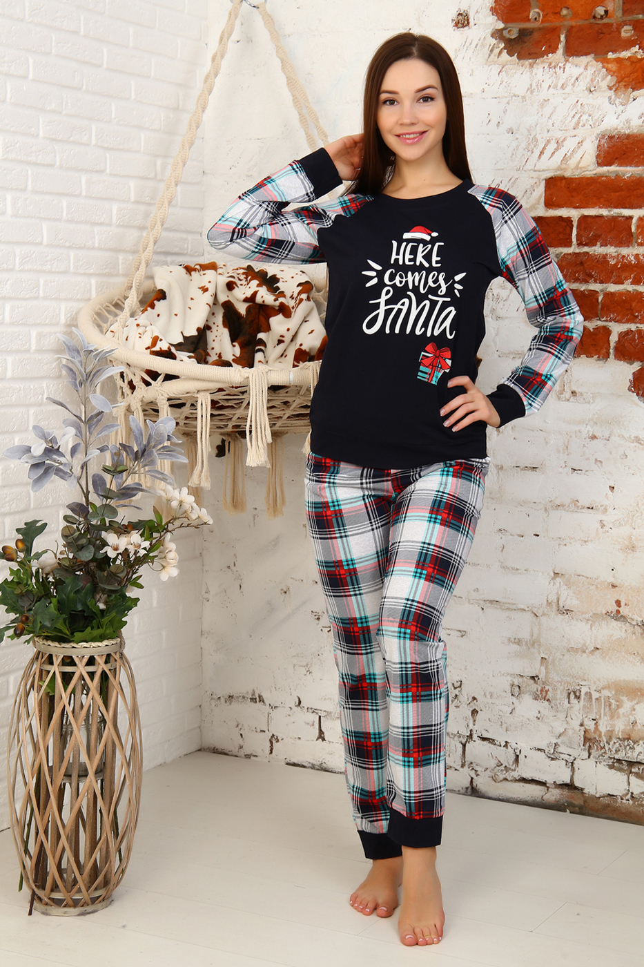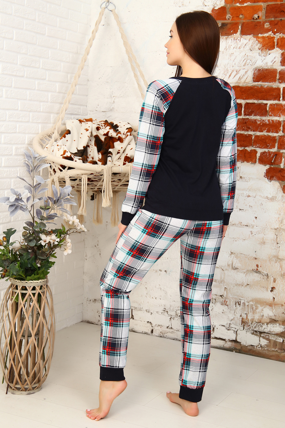 Ткань кулирка Состав 100% хлопок Описание Костюм женский из кулирного полотна состоит из кофты и брюк. Кофта прямая, рукав реглан из ткани клетка, низ на манжете, горловина круглая, обработана обтачкой, низ изделия с поясом, на полочке принт. Брюки прямые из ткани клетка, верх на поясе с резинкой, низ на манжете, в боковых швах внутренние карманы.